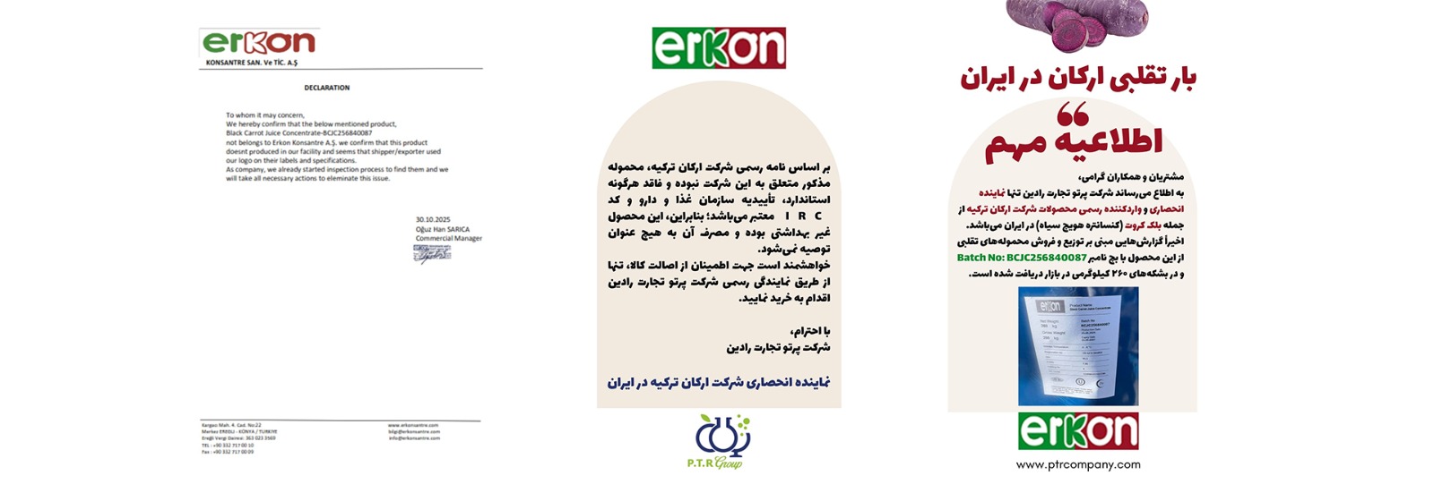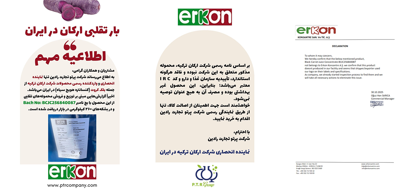 مشتریان و همکاران گرامی،به اطلاع میرساند شرکت پرتو تجارت رادین تنها نماینده انحصاری و واردکننده رسمی محصولات شرکت ارکان ترکیه از جمله بلک کروت (کنسانتره هویج سیاه) در ایران میباشد.